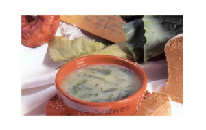 Cozinhe as batatas no caldo de galinha por 30 minutos. Retire, passe pela peneira e volte ao fogo. Quando ferver junte a couve, abaixe o fogo e deixe por mais 10 minutos. Adicione o azeite e sirva a seguir.